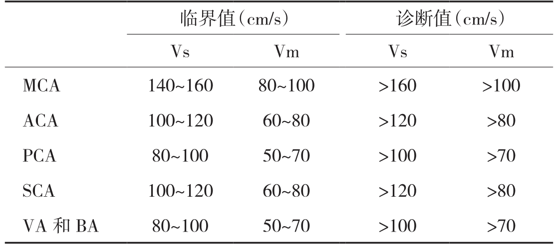 1 顱內(nèi)血管狹窄血流速度診斷標(biāo)準(zhǔn)(>40歲年齡組)