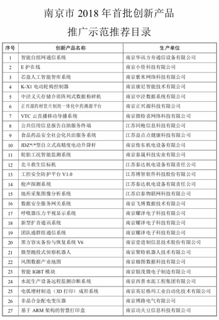 市政府關(guān)于印發(fā)南京市2018年首批創(chuàng)新產(chǎn)品推廣示范推薦目錄的通知