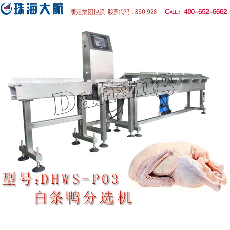 珠海大航白條鴨分級稱,是一種高速度、高精度的在線稱重設(shè)備,主要用于各種自動(dòng)化流水線上的動(dòng)態(tài)稱重,以及重量自動(dòng)分級。